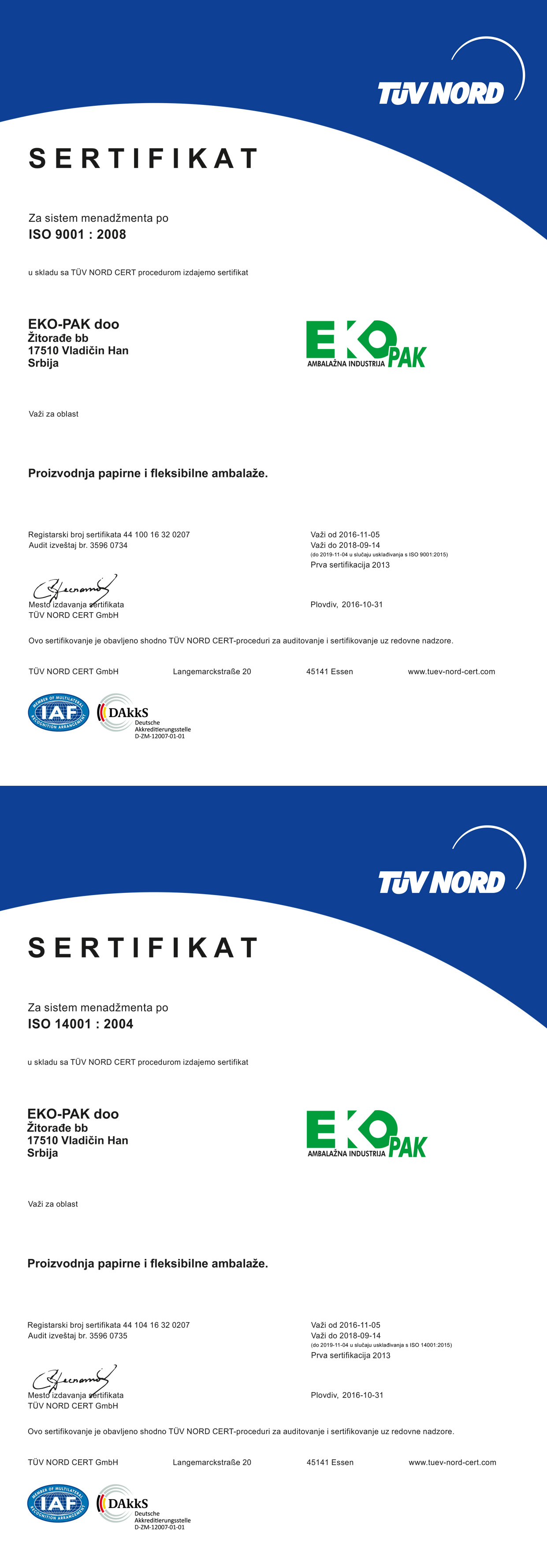 Preduzeće "Eko-Pak" je u oktobru 2016. godine, uspešno završilo još jedan proces resertifikacije sistema od strane "RS CERT-a" zastupnika "TUV NORD CERT Gmbh" i dobilo međunarodno priznate sertifikate ISO9001:2008 i ISO 14001:2004